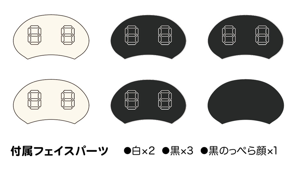 ・パーツカラー:ホワイト、黒、オレンジ、ブルー・フェイスパーツ:白×2、黒×3、黒のっぺら顔×1