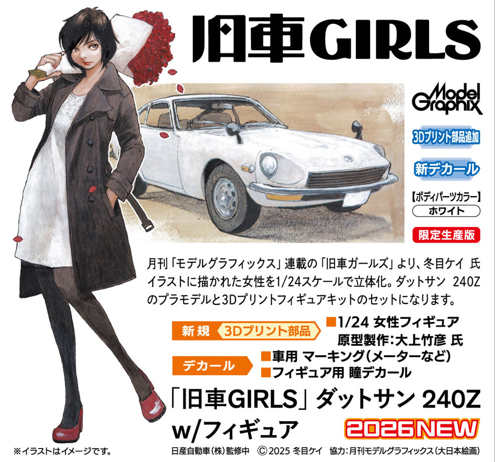 月刊「モデルグラフィックス」連載の「旧車ガールズ」より、 冬目ケイ 氏イラストに描かれた女性を1/24スケールで立体化。 ダットサン 240Zのプラモデルと3Dプリントフィギュアキットの セットになります。